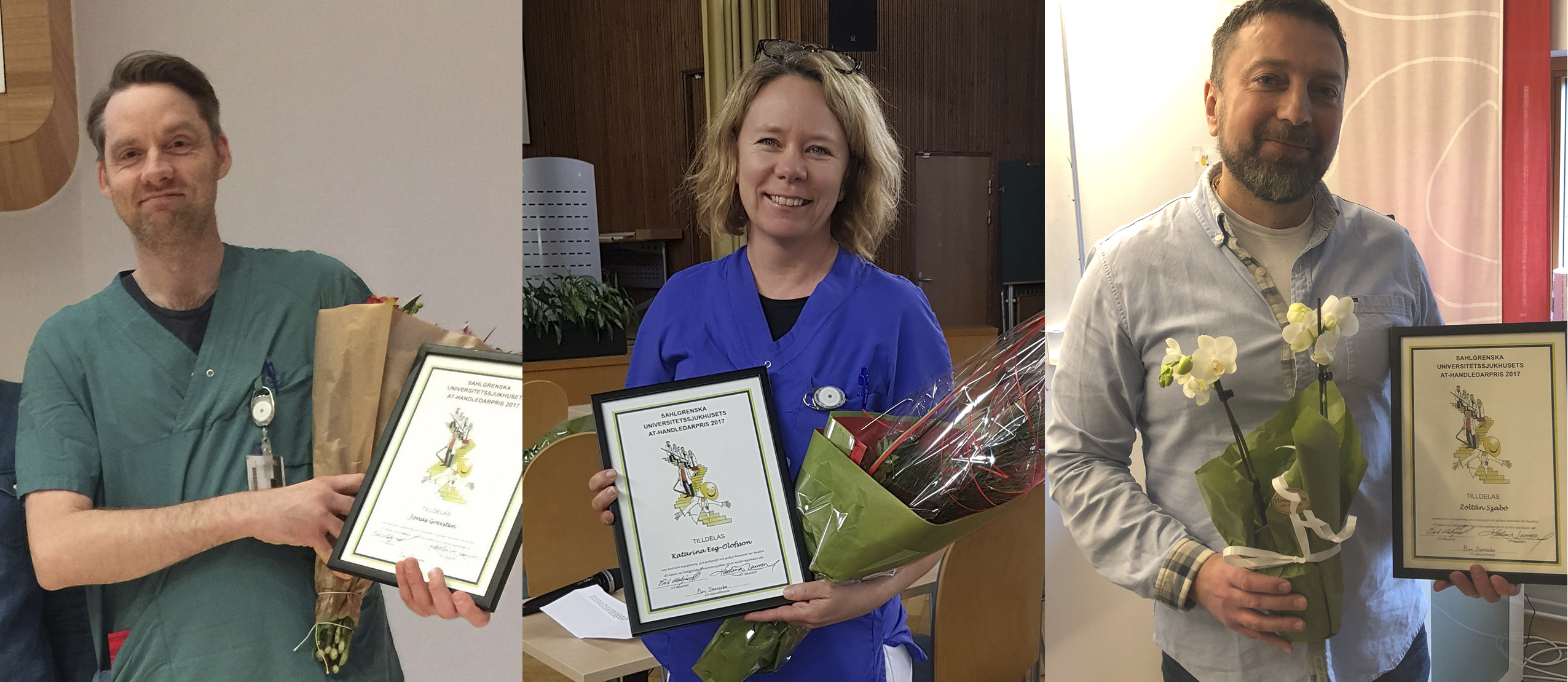 Specialistläkarna Jonas Grevsten, Katarina Eeg-Olofsson och Zoltán Szabó får 2017 års handledarpris av AT-läkarna på Sahlgrenska universitetssjukhuset (SU) i Göteborg.