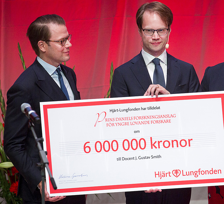 – Vi har bland annat hittat en genvariant som verkar vara kopplad till sämre överlevnad hos patienter med hjärtsvikt. Hjärt-Lungfondens anslag gör det möjligt för oss att fortsätta vårt arbete med att identifiera nya behandlingsmål och biomarkörer som kan förebygga och skräddarsy behandling vid hjärtsvikt, förklarar Gustav Smith, i ett pressmeddelande i samband med att han tog emot sexmiljonerschecken ur Prins Daniels hand den 8 september.