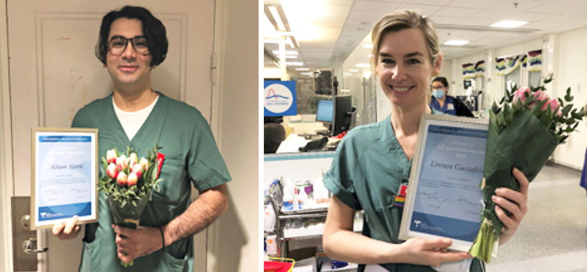 2020-års AT-handledarpris på Sahlgrenska universitetssjukhuset tilldelas Linnea Gustafsson och Aiham Alaraj.