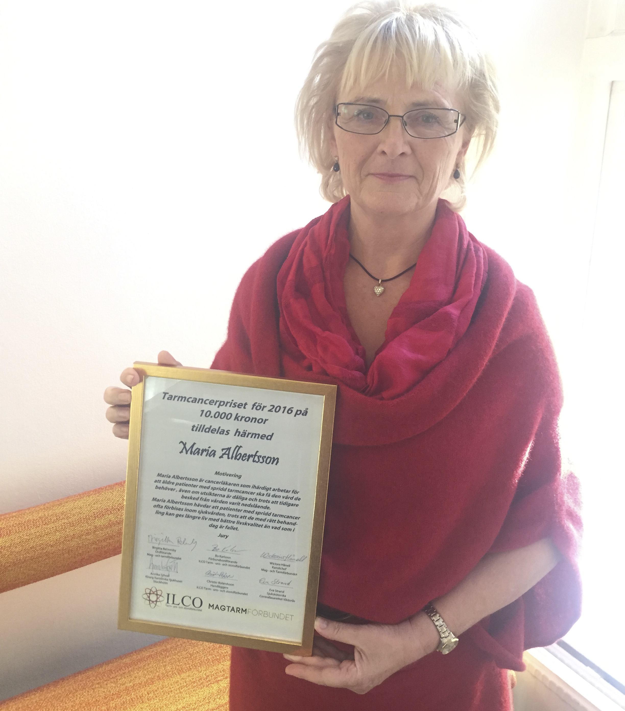 Maria Albertsson, professor i onkologi och överläkare vid Universitetssjukhuset i Linköping fick utmärkelsen Årets Tarmcancerpris 2016 på patientföreningen Mag- och Tarmförbundets Tarmcancerdag den 10 mars.