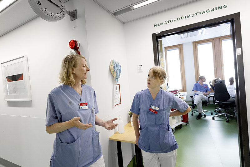 »Vi hematologer lär oss ganska mycket om genetik och har varit ganska tidigt ute med precisionsmedicin«, säger Tove Wästerlid (t h) i samspråk med Kristina Sonnevi (t v). Foto: Rickard Kilström