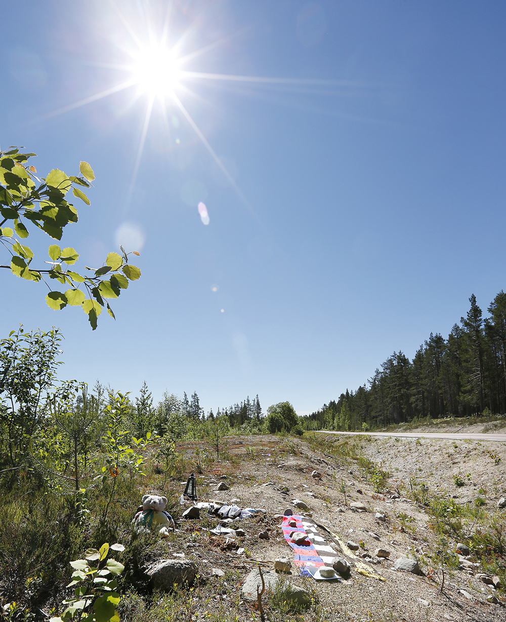 Med bil tar vi en kort tur söderut från hälsocentralen till olycksplatsen. Kort efter Sveg – med omkring 2 500 invånare i tätorten – blir bebyggelsen glesare för att en bit före olycksplatsen övergå till ett rent skogs- och sjölandskap.