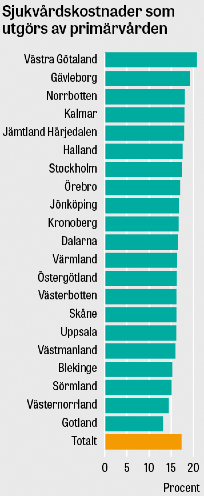 Siffror från Sveriges Kommuner och landsting, SKL, visar att kostnaderna för primärvården utgjorde cirka 17 procent av sjukvårdens totala nettokostnader i Sverige 2016.
