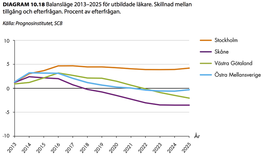 Efterfrågan på läkare i de regioner som rapporten omfattar beräknas öka med mellan 15 och 20 procent fram till 2025. Eftersom tillgången på arbetskraft väntas utvecklas i takt med efterfrågan är prognosen en relativt balanserad arbetsmarknad.