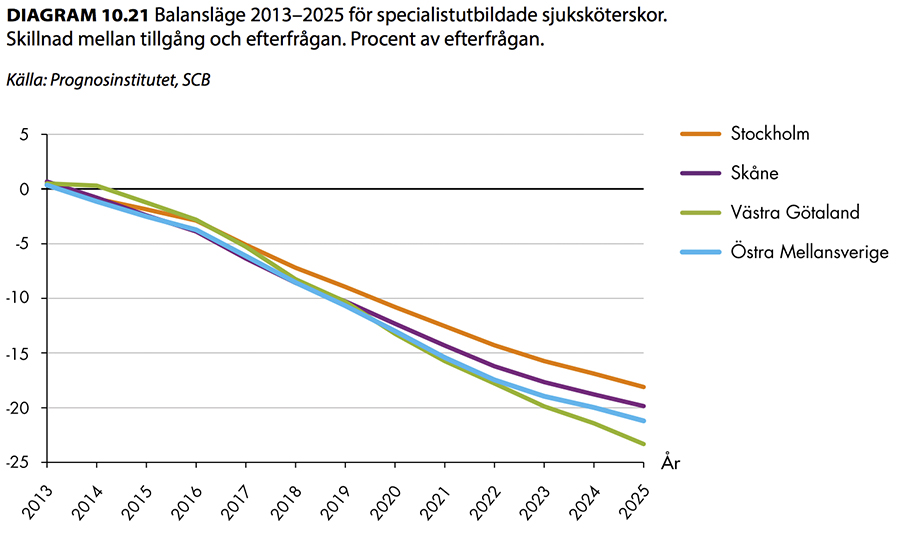 När det gäller specialistsjuksköterskor kommer efterfrågan att öka något mer än för läkarna, 25 procent i Stockholms län och i Västra Götalandsregionen, och med mellan 15 och 20 procent i Skåne och Östra Mellansverige. Tillgången kommer dock att minska något i Stockholms län och med cirka 5–10 procent i övriga regioner. Detta i kombination med pensionsavgångar – ungefär 45 procent av dem i arbetskraften är i dag 55 år eller äldre – innebär att dagens brist riskerar att förstärkas i samtliga regioner, enligt prognosen. Även om man tar med den planerade ökningen av utbildningsplatser på specialistsköterskeutbildningen, som angavs i 2015 års budget, riskerar bristen att förstärkas i samtliga regioner.