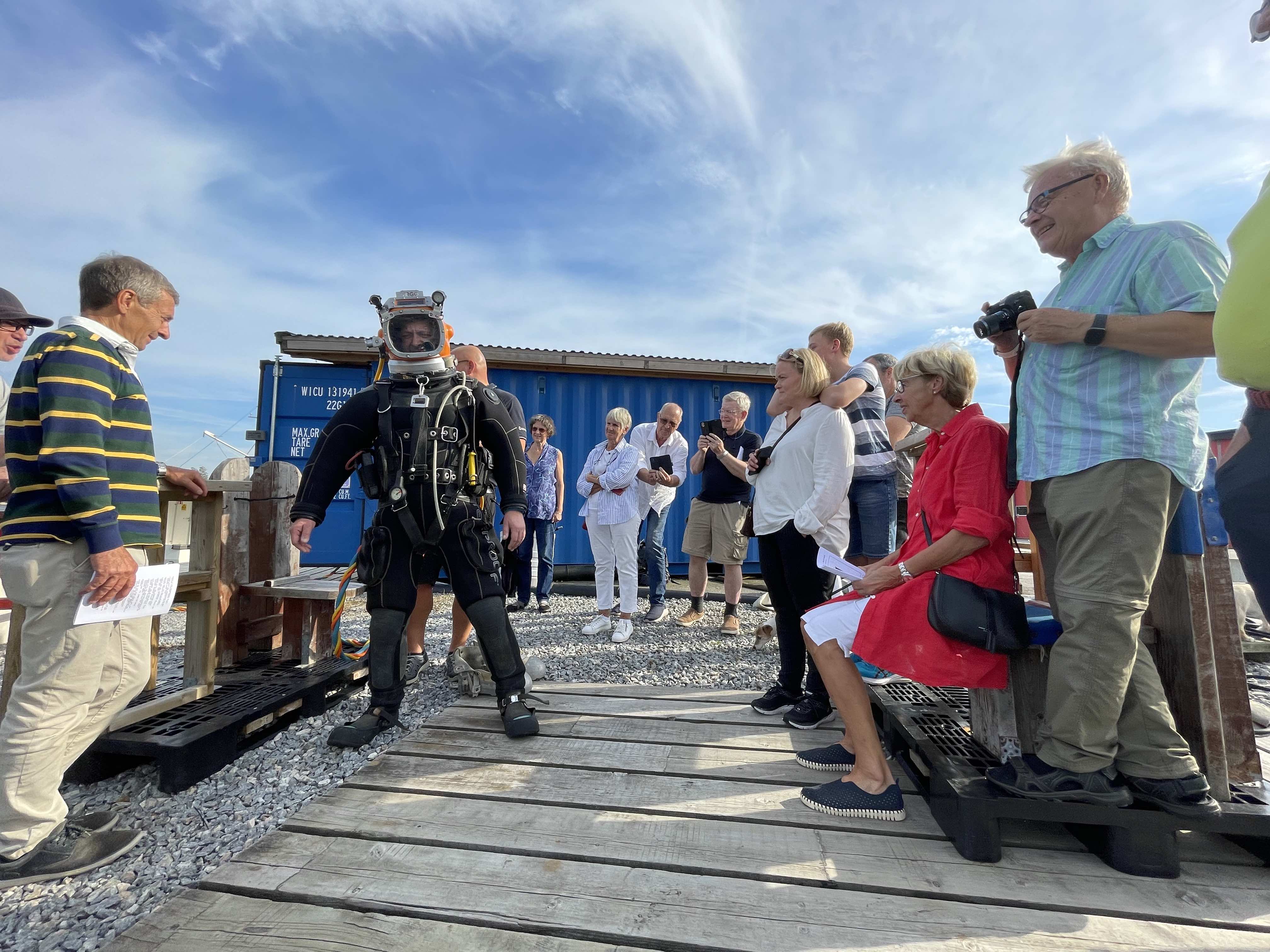 Martin Kriz i dykardräkten. Här har luften börjat fyllas på. Hela gänget är nyfikna och tar bilder på sin kollega som snart ska ned i vattnet – men han får inte dyka. Foto: Helena Wrete