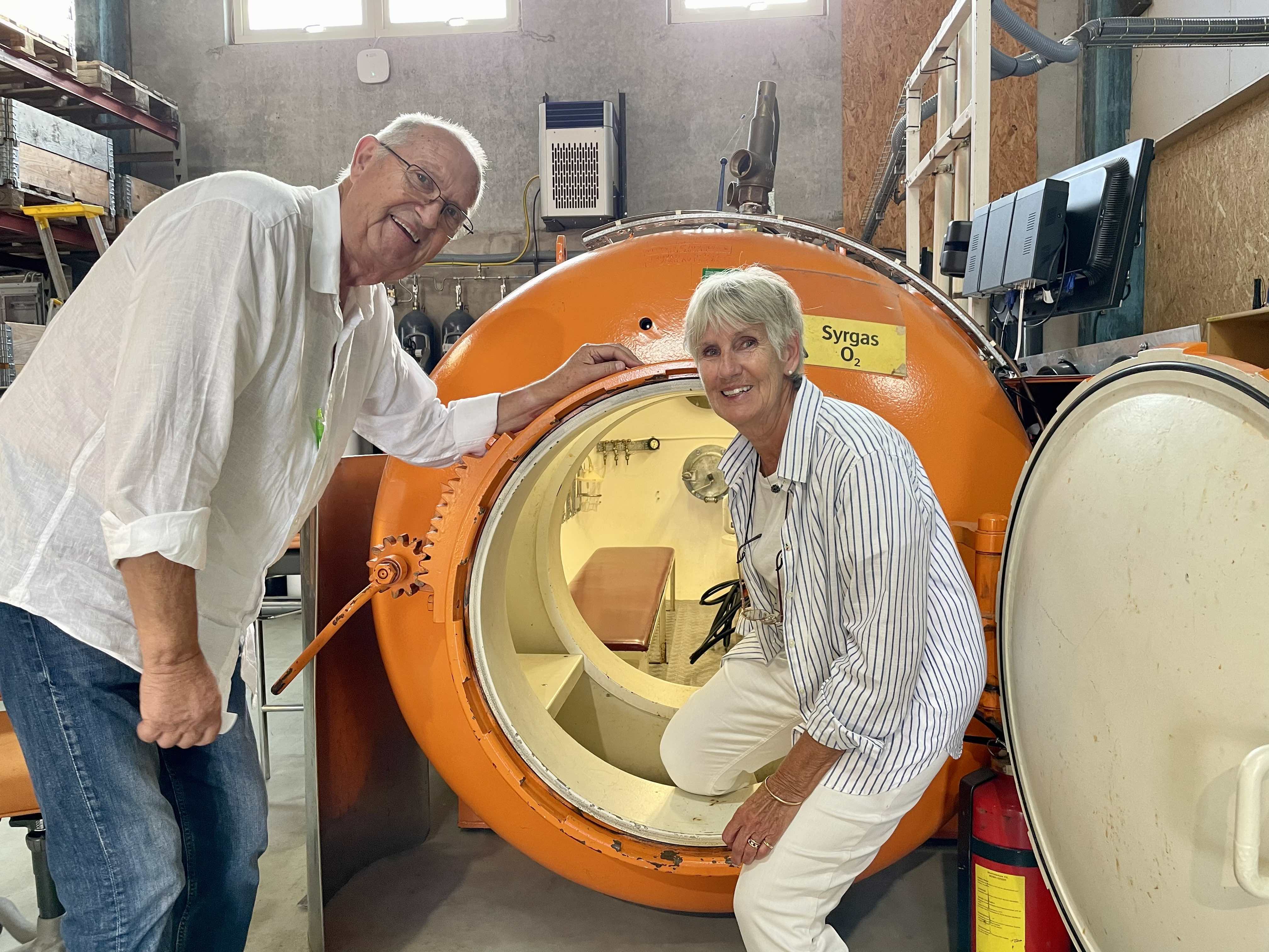 Hans Örnhagen och hans fru Bisse Örnhagen, som arbetat som intensivvårdssjuksköterska, visar yrkeshögskolans tryckkammare. Foto: Helena Wrete