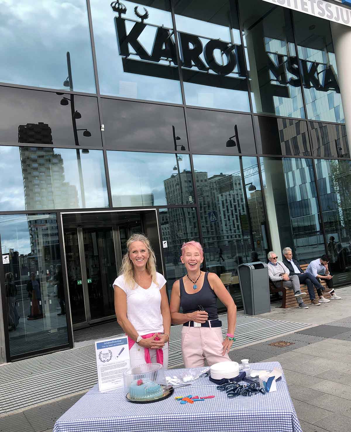 Allmänläkaren Maria Zetterlund Gustafsson (till vänster) och psykiatern Jill Taube startade »Vem tar hand om doktorn?« för ett år sedan. I dag bjöd de på tårta utanför Nya Karolinska Solna. Foto: Privat
