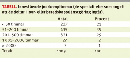 Av rapporten, »Sjukhusläkarnas jourenkät 2011«, framgår att i snitt vart femte beredskapspass under vardagar är ostört, men bara vart tionde under helg. Beredskap under helger innebär en större belastning än under vardagar. Var åttonde sjukhusläkare anger att man under helg arbetar halva beredskapstiden eller mer. 30 procent arbetar då 26–50 procent av tiden, medan nästan lika många (28 procent) arbetar 11–25 procent av beredskapstiden.
