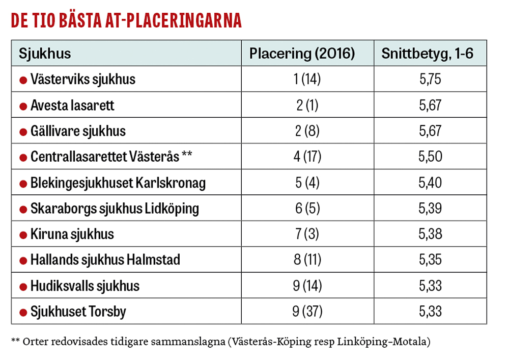 I toppskiktet i årets AT-rankning återfinns flera av de orter som legat högt i de senaste årens rankningar. Avesta, som toppat listan två år i rad, hamnar i år på en delad andraplats med Gällivare sjukhus.