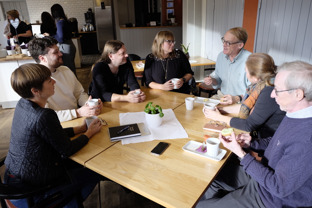 Merparten av förhandlingsdelegationen samlad för en fikapaus i arbetet. Från vänster Sofia Rydgren Stale, Martin Macek, Robert Holmqvist, Malin Bohlin, Johan Styrud, Nadja Schuten Huitink och Inge Eriksson. Elin Karlsson saknas på bilden. Foto: Lucas Tarcheh