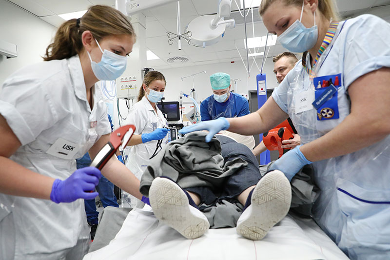 Läkare, sjuksköterskor och undersköterskor i traumateamet på Universitetssjukhuset i Linköping vässar sin kompetens genom regelbundna övningar. Foto: Jeppe Gustafsson