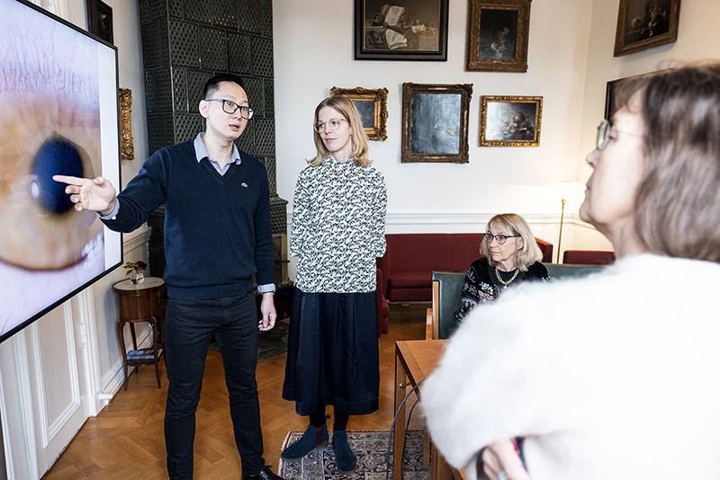 Yutong Guo och Moa Nordström blir utfrågade av Monica Lövestam Adrian och Angelika Skarin i Sveriges ögonläkarförenings examinationskommitté. FOTO: André de Loisted