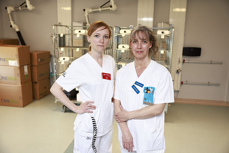 Zarita Nilsson (t h), sjuksköterska och ledamot i den nationella arbetsgruppen för obstruktiv sömnapné hos vuxna, och läkare Louise Wittmeyer Cedervall (t v) på mottagningen vid Lasarettet i Ystad. Foto: Peter Kroon