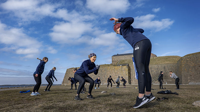 Neptunuskliniken tränar på arbetstid. I bagrunden syns Varbergs fästning. Foto: Magnus Gotander