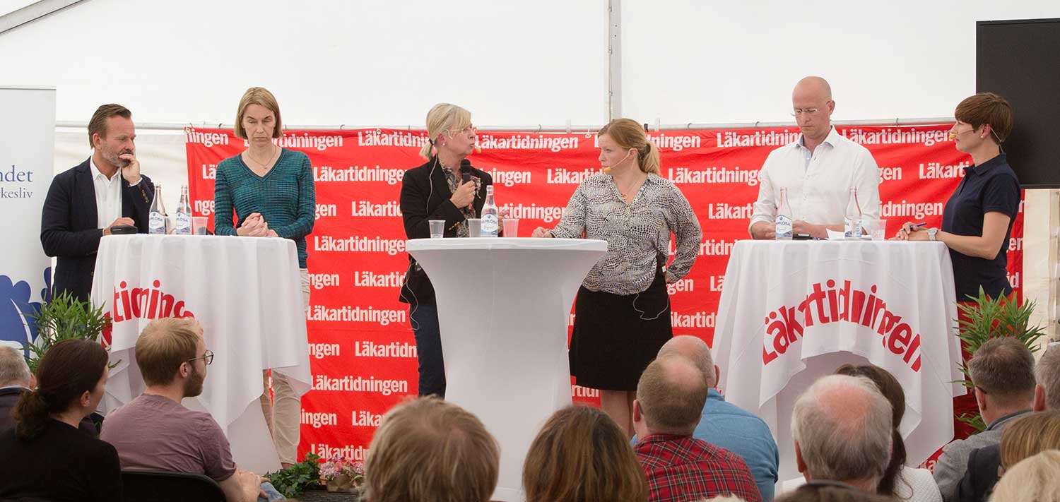 Hela panelen under debatten om vårdplatser. Från vänster: Fredrik Lennartsson, generaldirektör för Myndigheten för vård- och omsorgsanalys, Olivia Wigzell, generaldirektör för Socialstyrelsen, Gunilla Hulth-Backlund, generaldirektör för Inspektionen för vård och omsorg, Elin Karlsson, vice ordförande Sjukhusläkarna, Lars Rocksén, ST-läkare i anestesi och intensivvård vid Örnsköldsviks sjukhus och Sofia Rydgren Stale, ledamot av Läkarförbundets styrelse och moderator. Foto: Ola Torkelsson