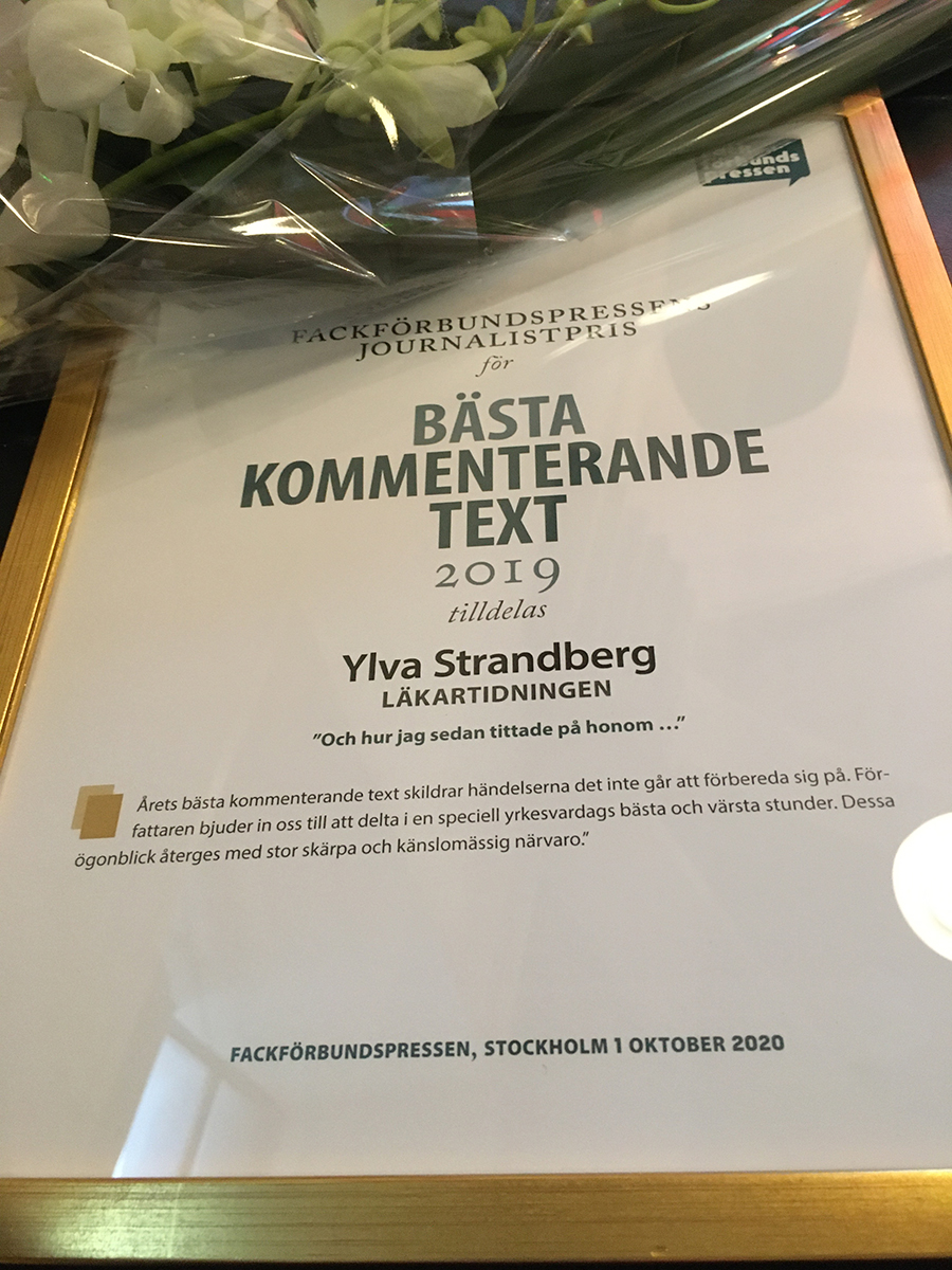 Ylva Strandberg, överläkare i gynekologi och obstetrik vid Sahlgrenska universitetssjukhuset i Göteborg, har vunnit Fackförbundspressens journalistpris i kategorin Bästa kommenterande text 2019.