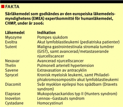 Under 2006 fick den europeiska läkemedelsmyndighetens (EMEA) kommitté för särläkemedel, Committee for orphan medicinal products (COMP), ta ställning till 104 ansökningar om klassificering som särläkemedel. Av dessa höll 81 ansökningar måttet, vilket i den fortsatta produktutvecklingen innebär stora fördelar i form av bland annat kostnadsfri rådgivning och en reducerad ansökningsavgift när läkemedlet sedan ska godkännas av EMEAs expertkommitté för humanläkemedel, CHMP.