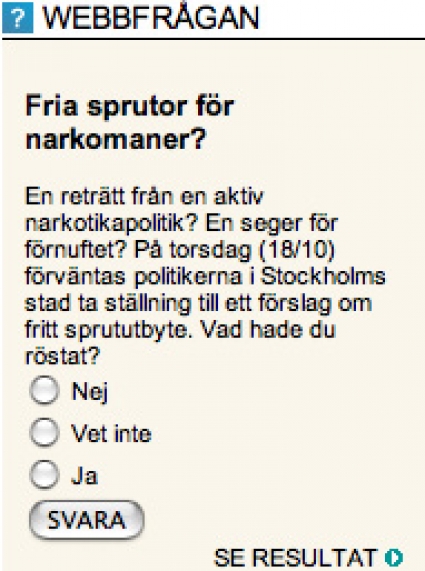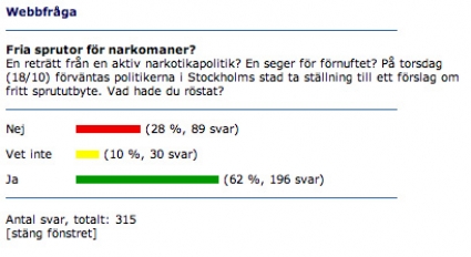 Förra veckans webbfråga Så här svarade besökarna på frågan om det är rätt eller fel att erbjuda fria sprutor till narkomaner.