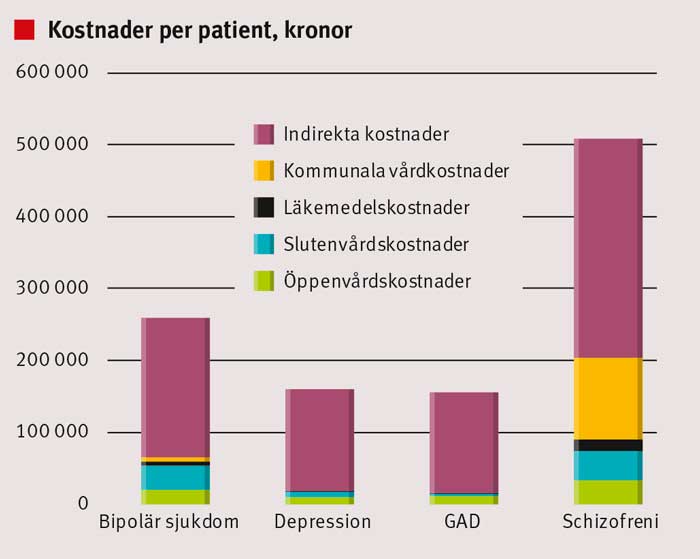 Utvalda patientkarakteristika visas i Tabell I och kostnad per patient i Figur 1. För schizofreni uppgick kostnaden till 509 000 kronor per patient under år 2008, varav 60 procent var indirekta kostnader. Endast en liten andel av patienterna med schizofreni deltar i arbetslivet, vilket förutom höga kostnader för samhället kan bidra till social isolering och ekonomiska problem för individen. Bipolär sjukdom kostade totalt 259 000 kronor per patient, av vilket 75 procent var indirekta kostnader. Kostnaderna var likartade för bipolär typ I och II. Depression och GAD var förenade med likartade kostnader, även om kostnaden för slutenvård var något högre för depression. Den totala kostnaden för depression var 159 000 kronor per patient (88 procent indirekta kostnader), medan den totala kostnaden för GAD var 156 000 kronor per patient (90 procent indirekta kostnader).