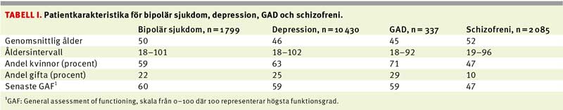 Avidentifierade data om diagnoser (ICD-10), öppenvårdsbesök och slutenvård hämtades från Norra Stockholms psykiatri för perioden 2006–2008 efter etiskt godkännande av studien (regionala etikprövningsnämnden i Stockholm, diarienummer 2008/1784-31/5). Antalet patienter varierade från 337 för GAD till drygt 10 000 för depression (Tabell I). Norra Stockholms psykiatri hade vid tiden för studien (2008) ett upptagningsområde som omfattade 317 000 av totalt 674 000 invånare över 18 år i Stockholms stad.