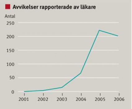Resultatet av sjukhusets säkerhetsarbete visar till exempel att läkare rapporterar in tredubbelt så många avvikelser som när arbetet startade för fem år sedan (Figur 2). Men än så länge ligger de långt efter sjuksköterskorna. När läkarna lämnar in cirka 200 avvikelser varje år hamnar sjuksköterskorna över 3000 stycken. Carina Forsberg säger att sjukhuset aktivt försöker jobba bort syndabockstänkandet för att locka till fler anmälningar på sjukhuset. I stället för att fokusera på vem som var inblandad i det enskilda fallet ska sjukhuset se på vad som hände och hur »bristen« eller »risken« ska förhindras.