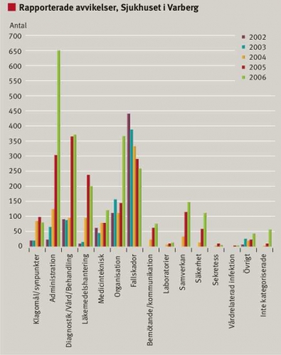Allt allvarligare och tyngre risker märks i avvikelsehanteringssystemet på Varbergs sjukhus. Många av dem är så svåra att de senare anmäls som Lex Maria-ärenden. Man kan börja tala om en våg, en effekt av sjukhusets interna patientsäkerhetsarbete som pågått sedan 2001. Sedan 2002 har antalet rapporterade avvikelser ökat markant, från 760 till 2 397 fall år 2006. Under det senaste året märks en trend – mest ökar rapporterade avvikelser som handlar om »organisation« och »administration« (Figur 1). I siffror innebär detta att antalet avvikelser som rör organisation har ökat från 140 fall under 2005 till 360 fall under 2006; antalet som rör administration har ökat från 300 till 650 fall. I rubrikerna ryms risksituationer som till exempel dålig tillgänglighet, bemanningsproblem, organisationsstruktur, brist på rutiner och dokumentationssystem. Under den senaste tiden kommer det allt fler signaler om att det saknas resurser.