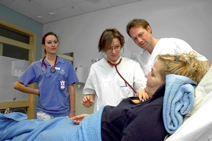 – Studenterna gör allt med patienterna, säger Pia Hallor, sjuksköterska vid KUA i Linköping. Det blir ett teamarbete där man både ska se sig själv i sin yrkesroll och se hur de andra yrkeskategorierna arbetar. Att leda ronden, skriva läkemedelslistor och kontakta konsulter är läkarstudentens ansvar. Handledarna håller sig i bakgrunden och fångar upp frågor, kontrasignerar läkemedelslistor och står för kontinuiteten på avdelningen.
