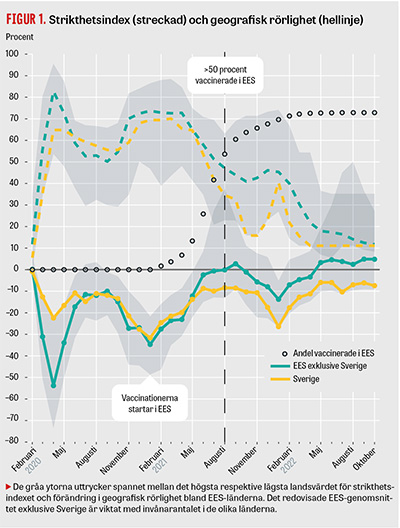 I Figur 1 visar den streckade linjen hur strikthetsindex varierade mellan länder och över tid. Under de tre första månaderna, februari–april 2020, utmärkte sig Sverige som ett av de EES-länder som hade lägst nivå av smittskyddsåtgärder. I maj 2020 började övriga EES-länder minska sina åtgärder. I juni samma år hade övriga EES-länder i genomsnitt en lägre nivå än Sverige, som behöll många av åtgärderna under sommaren och hösten 2020 medan andra EES-länder öppnade sina samhällen.