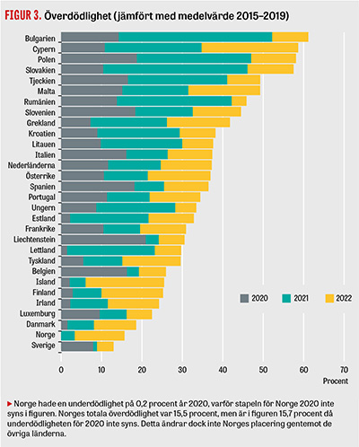 I Figur 3 visas överdödligheten. Sverige hade en relativt hög överdödlighet under pandemins första år, 2020, högre än de övriga nordiska länderna. Under de efterföljande åren 2021 och 2022 hade Sverige dock en betydligt lägre överdödlighet än övriga Norden och övriga EES-länder. Sammantaget, sett till hela pandemiperioden 2020–2022, hade Sverige lägst överdödlighet i EES, följt av de nordiska grannländerna Norge och Danmark. Även Finland och Island hade en lägre överdödlighet än de flesta EES-länder, den 6:e respektive 7:e lägsta i samarbetsområdet. Av de icke-nordiska länderna var det enbart Luxemburg och Irland som hade en lägre överdödlighet än Finland och Island.