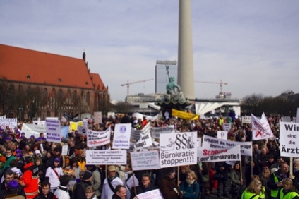 Strejken inleddes egentligen förra året, men efter att avtalsförhandlingarna gått i stå valde man i mitten av mars att återigen börja strejka. För en dryg vecka sedan samlades 6000 läkare i Hannover för att demonstrera. Iklädda vita rockar delade de ut information samt passade på att bjuda förbipasserande på gratis blodtryckskontroll. Förståelsen för strejken från allmänhetens och patienternas sida är störst vad gäller arbetstiderna och mindre vad gäller kraven om lönehöjningar på 30 procent.