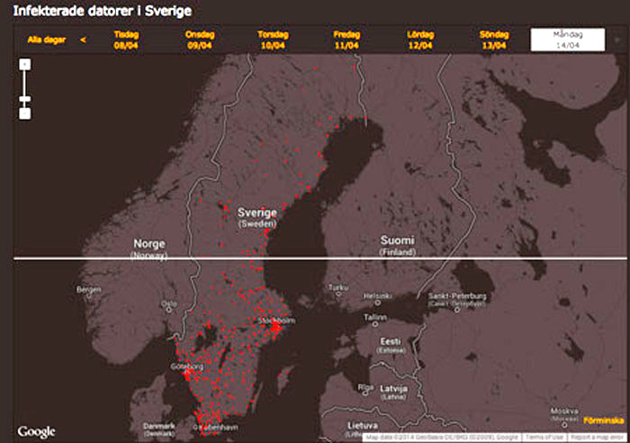 Myndigheten för samhällsskydd och beredskap tillahandahåller tjänsten ‹cert.se› som visar antalet infekterade datorer i Sverige. Varje röd prick på kartan representerar en ort i Sverige där det finns infekterade datorer. Ju större röd prick desto fler infekterade datorer.
