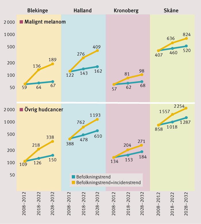 Vi belyser den framtida utvecklingen baserat på prognoser för insjuknande i malignt hudmelanom och skivepitelcancer i södra Sverige. Figur 1 visar prognoser för fall av malignt hudmelanom respektive övrig hudcancer (huvudsakligen skivepitelcancer, exklusive basalcellscancer) i ett 20-årsperspektiv för Blekinge, Halland, Kronoberg och Skåne enligt: