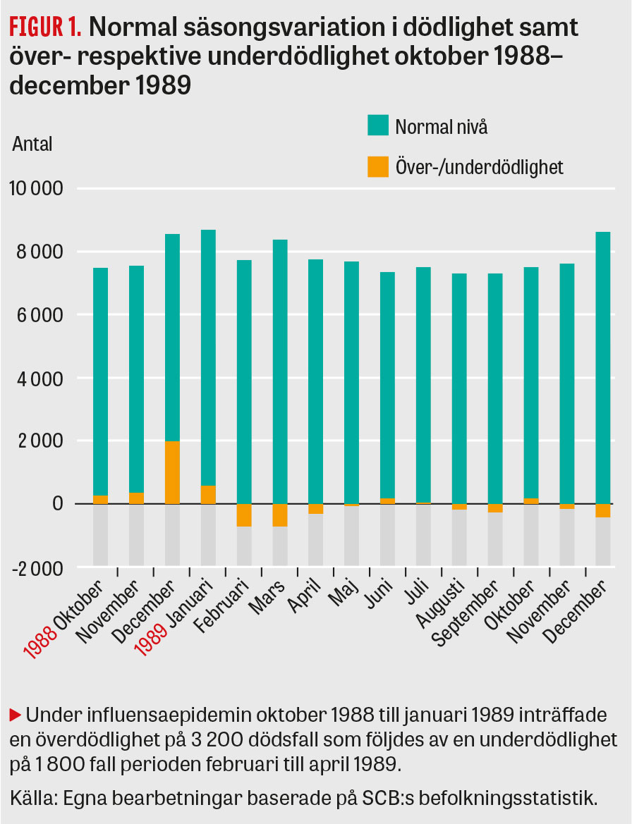 När vi drabbas av säsongsinfluensa är det framför allt sköra individer som dör. Låt oss ta ett exempel: Under tremånadersperioden efter influensaepidemin 1988/1989 dog det 1 800 färre personer än normalt. Det är ett typiskt mönster som upprepats efter influensaepidemier. På goda grunder kan man därför påstå att drygt hälften av dem som dog i influensaepidemin 1988/1989 bara skulle ha levt ytterligare några månader om epidemin inte hade inträffat (Figur 1).