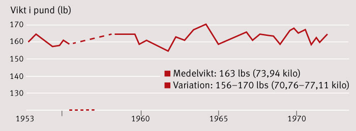 I en artikel som publicerades i Lancet 1973 [2] beskriver dr Fox hur han åren 1953–1973 vägde sig dagligen på ett standardiserat sätt. Trots att hans aptit och mängden fysisk aktivitet varierade under den nästan 20-åriga tidsperioden var dr Fox viktkurva mycket stabil (Figur 1). Detta antyder att kaloriintaget under alla dessa år balanserats mot energiförbrukningen på ett för dr Fox ändamålsenligt sätt, och att hans »termostat« för viktkontroll fungerat utmärkt.