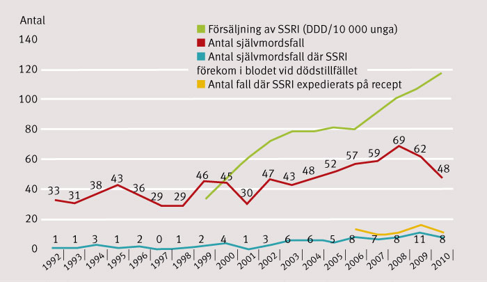 Mellan 2003 och 2008 steg det årliga antalet självmord linjärt med 60 procent bland svenska 10–19-åringar. Varningar för användning av antidepressiva läkemedel hos barn och unga kom från läkemedelsmyndigheterna i Storbritannien, EU (EMA) och USA (FDA) år 2003. Läkemedelsverket varnade i december 2004 för behandling med SSRI vid depression hos barn och unga: »Dessa läkemedel bör generellt inte användas i denna åldersgrupp eftersom kliniska prövningar har visat en ökad risk för självmordstankar och självmordsförsök hos barn och ungdomar«. Så starka uttalanden förväntas baseras på stark evidens. Så var inte fallet [1].