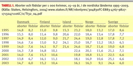 Som svar på Seidals statistikredovisning presenterar vi ett finskt statistikprogram om tonåringars abort- och födelsetal i de fem nordiska länderna [2]. Tabell I ger utvecklingen under det senaste decenniet; Figur 1 visar mönstret på 2000-talet. Alltsedan 1970-talet har tonårsgraviditeterna minskat, särskilt har barnafödandet sjunkit (utom i Island). Även om mönstret varit likartat i de fem länderna finns idag skillnader, tex när det gäller andelen tonåringar som vid en graviditet väljer att föda barn, alltså proportionen mellan aborter och födslar.