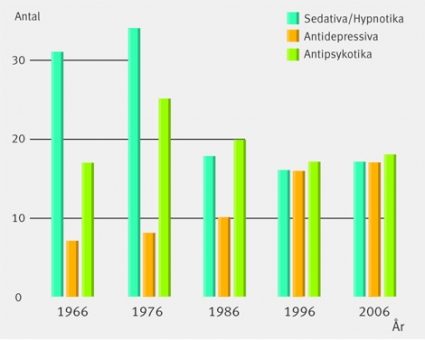 Mellan 1966 och 1986 minskade sedativa- och hypnotikagruppen, bland annat genom att barbituraterna försvann, medan antalet antidepressiva successivt ökat. De nya SSRI-preparaten har registrerats utan att de äldre tricykliska avregistrerats i samma takt. Bland neuroleptika har nya så kallade atypiska antipsykotika tillkommit samtidigt som en del äldre successivt försvunnit.