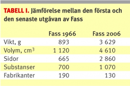 En jämförelse mellan Fass 1966 och 2006 (Tabell I) visar hur böckernas omfång ökat, liksom antalet substanser. För 40 år sen fanns inte så många synonymer, generika var ett nästan okänt begrepp, så antalet registrerade preparat låg närmare antalet substanser än idag. Det är till stor del de generiska preparaten som betingar vikt- och volymökningen av Fass under de senaste åren, eftersom de presenteras med samma eller nästan samma textomfång som originalpreparaten.