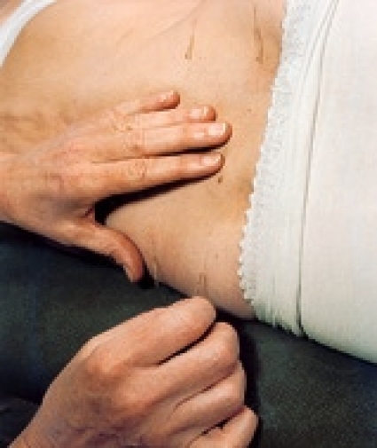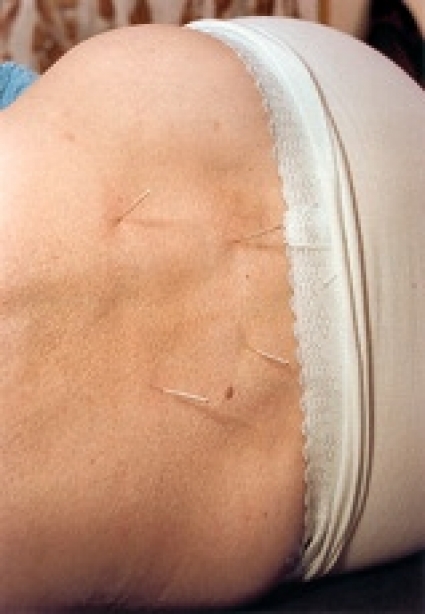 I akupunkturstudier är det problematiskt att åstadkomma en trovärdig placebo-kontroll. Det är viktigt att denna har lika stor psykologisk inverkan som den riktiga akupunkturen, vilket innebär att nålar bör användas, men utan att de medför mer än en ytterst minimal fysiologisk stimulering [4]. I de båda klimakteriestudierna [1-3] användes en enkel procedur där mycket små, tunna nålar fästes an mot huden extremt ytligt i allra yttersta nålspetsen, och utanför de klassiska akupunkturpunkterna, som användes i EA-gruppen. Infästningen i huden var så ytlig att en del nålar ramlade av genast och en del under behandlingstidens gång. Resterande nålar hängde löst kvar längs med huden, utan ytterligare manipulering (Figur 2). Endast undantagsvis gav proceduren upphov till någon sensation över huvud taget. Denna placebokontroll var möjlig att genomföra eftersom kvinnorna låg på sidan med filt och kuddar omkring sig och därför inte kunde se nålarna [3]. Situationen inbjöd till ett unikt tillfälle att åstadkomma en bra placebokontroll till EA. För att vara helt korrekt bör den benämnas »nära-placebokontroll«, eftersom en minimal sensorisk stimulering inte går att undvika.