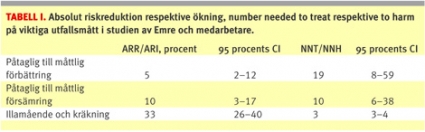 I litteraturen om evidensbaserad medicin framhålls att ett bortfall överstigande 20 procent av studiedeltagarna bör diskvalificera studien som beslutsunderlag på klinisk nivå [3]. Om man trots detta kompletterar studiens [2] resultatredovisning av den primära effektvariabeln (Alzheimer’s Disease Cooperative Study–Clinician’s Global Impression of Change) med en beräkning av number needed to treat (NNT), absolut riskreduktion (ARR) respektive riskökning (ARI) och deras 95 procents konfidensintervall (CI) på de kliniskt rimliga förbättringsnivåerna »påtaglig« (marked) och »måttlig förbättring eller försämring« (moderate improvement/worsening) – det vill säga avsaknad av försämring likställs med behandlingseffekt – (Figur 2 [2]), samt adderar number needed to harm (NNH) för de helt sannolika kolinerga biverkningarna illamående och kräkning (Tabell 3 [2]) fås de data som visas i Tabell I ovan.