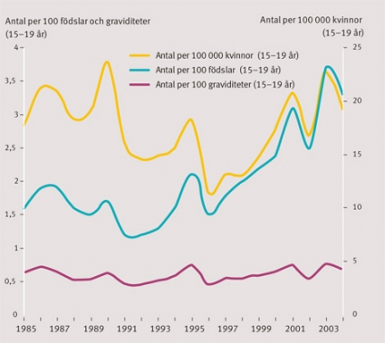 När de ektopiska tonårsgraviditeterna relateras till 100000 kvinnor i åldersgruppen 15–19 år kan förändringar följas över ett längre tidsperspektiv. Man kan komplettera med en beräkning av antalet ektopiska graviditeter relaterade till antalet tonårsgraviditeter, grovt skattade som summan av födslar och legala aborter. Dessa olika beräkningsgrunder framgår av Figur 1, som visar att det inte föreligger någon klart ökande tendens av ektopisk graviditet bland tonåringar sedan 1985. Viss variation är också legio.