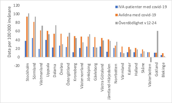 Figur 1. Populationsjusterade data per region om IVA-patienter med covid-19, avlidna med covid-19 (Folkhälsomyndighetens databas den 6 juli 2020) samt överdödlighet under vecka 12–24/2020 jämfört med medelvärde samma veckor 2015–2019 (Statistiska centralbyrån).