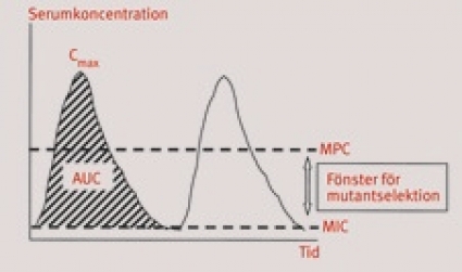 Ett annat ofta använt mått är AUC/MIC (Figur 1), som enligt djur- och humanstudier bör ha ett värde på 100–150 för att förebygga resistensutveckling [8]. Matematisk modellering har visat att sannolikheten för att uppnå AUC/MIC upp emot 150 med vanlig dosering av kinoloner endast är runt 60 procent [8], vilket starkt talar för att monoterapi med kinoloner utgör en stor riskfaktor för selektion av resistens hos Pseudomonas aeruginosa. Två undantag är keratit och extern otit, där den goda observerade utläkningen av Pseudomonas aeruginosa-infektioner med topikalt applicerade kinoloner visar att den lokala koncentrationen blir tillräckligt hög för att undvika mutantselektion [9, 10].