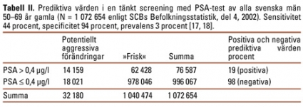 Om man tänker sig att erbjuda alla svenska män mellan 50 och 70 år screening med PSA-test så kan man få en uppfattning om hur många män som blir berörda (Tabell II). Den verkliga prevalensen av potentiellt aggressiva prostataförändringar är inte känd. Vi skattar den grovt till 3 procent [14, 17]. Det finns ganska få beräkningar av de på marknaden förekommande PSA-testens sensitivitet och specificitet. Det hela kompliceras dessutom av att halten PSA varierar med ålder och eventuella andra sjukdomstillstånd i prostatakörteln. Som gränsvärde har vi valt det kliniskt vanligt förekommande 0,4 µg/l. I en välgjord finsk studie med detta gränsvärde var sensitiviteten 39 procent och specificiteten 96 procent för män 65 år gamla, och 51 respektive 91 procent för män ≥65 år. För alla åldrar gällde 44 respektive 94 procent [18].