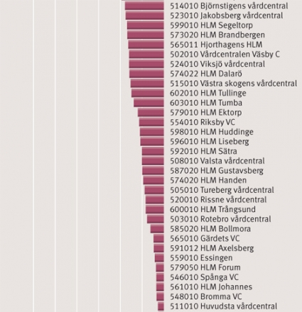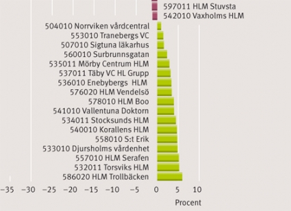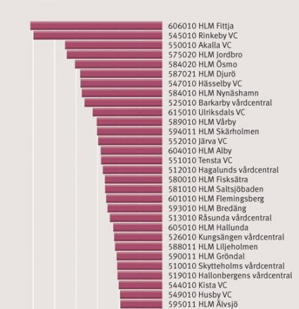 Något som också framgår av diagrammet från Stockholms läns sjukvårdsområdes ekonomiavdelning är att det är ett mindre antal vårdcentraler, främst i välbärgade områden, som vinner på det nya systemet. En stor andel vårdcentraler med hög psykosocial sjuklighet och tung arbetsbörda utan nämnvärd avlastning från privatläkare finns i den förlorande delen av skalan.