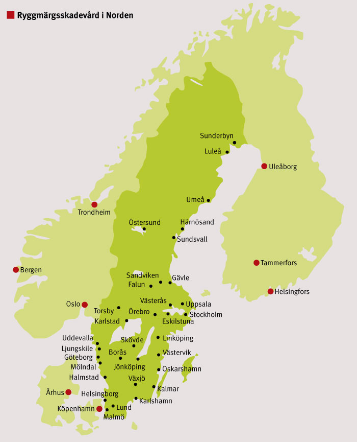 Figur 1. I Sverige behandlas ryggmärgsskadade på sjukhus över hela landet. Norge, Finland och Danmark har med goda resultat centraliserat rehabiliteringen till ett fåtal ryggmärgsskadecentra.