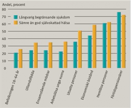 Det finns ett tydligt samband mellan social och ekonomisk utsatthet och hälsa. Sambandet innebär å ena sidan att social och ekonomisk utsatthet leder till ohälsa, å andra sidan att sjukdom och ohälsa medför negativa sociala och ekonomiska konsekvenser. I en färsk rapport [2] har vi belyst hälsa, livsvillkor, levnadsvanor och sjukvårdsutnyttjande bland socialt och ekonomiskt utsatta grupper i Stockholms län. Rapporten baseras på analyser av data från Folkhälsoenkät 2002 (n = 25 410) som länkats till registerdata om sjukvårdskonsumtion samt på djupintervjuer med mottagare av ekonomiskt bistånd (n=33) och intervjuer med hemlösa personer (n=155).
