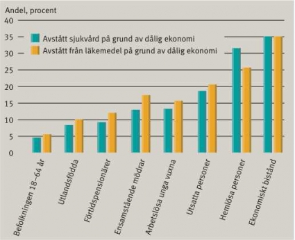Andelen som rapporterade långvarig begränsande sjukdom eller ohälsa ökade med graden av social och ekonomisk utsatthet och var särskilt hög bland personer som mottagit ekonomiskt bistånd (socialbidrag) och hemlösa personer (Figur 1). Sjukvårdskonsumtionen var något högre bland de studerade grupperna än i den övriga befolkningen (Figur 2), men inte så hög som skulle kunna förväntas med tanke på deras högre sjuklighet. En väsentligt större andel i de studerade grupperna hade dock på grund av dålig ekonomi avstått från sjukvård och tandvård och från att hämta ut ordinerade läkemedel (Figur 3). Bland mottagare av ekonomiskt bistånd hade 35 procent avstått från sjukvård jämfört med 5 procent i befolkningen i stort.