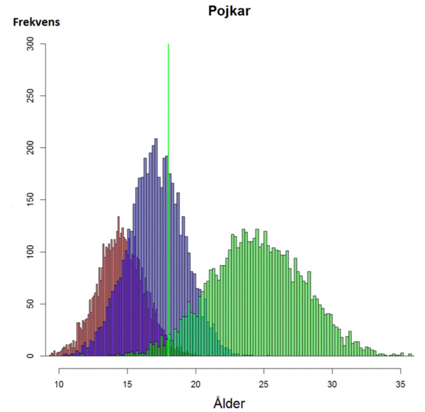 Figur 2. Åldersfördelningen för när knät mognar hos pojkar/män utifrån beräkningar baserade på Socialstyrelsens studie. Se utförlig kommentar till figuren i artikeln.